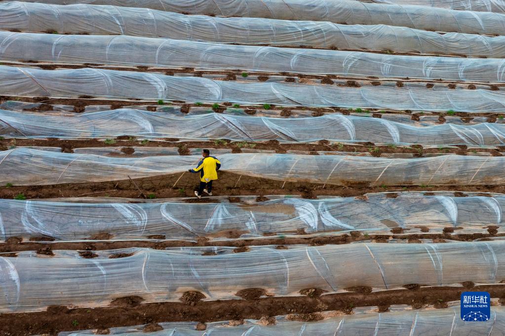 3月20日,農民在河南省商丘市閆集鎮湯莊村芹菜種植基地管理芹菜苗保溫棚(無(wú)人機照片)。