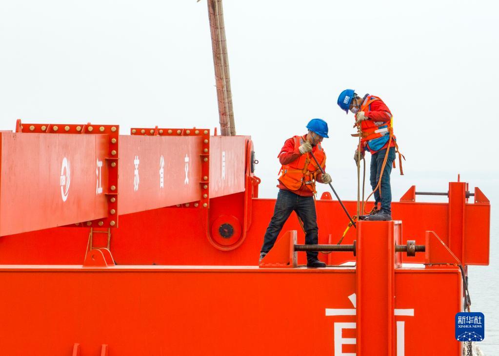3月20日,中交二航局建設者在常泰長(cháng)江大橋主航道橋泰州側施工現場(chǎng)安裝吊具(無(wú)人機照片)。