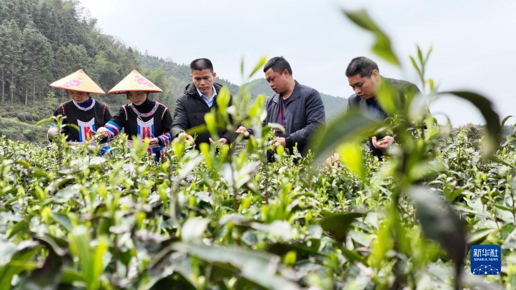 3月20日,在湖南衡陽(yáng)常寧市塔山瑤族鄉,技術(shù)人員在茶園指導茶農采茶(無(wú)人機照片)。