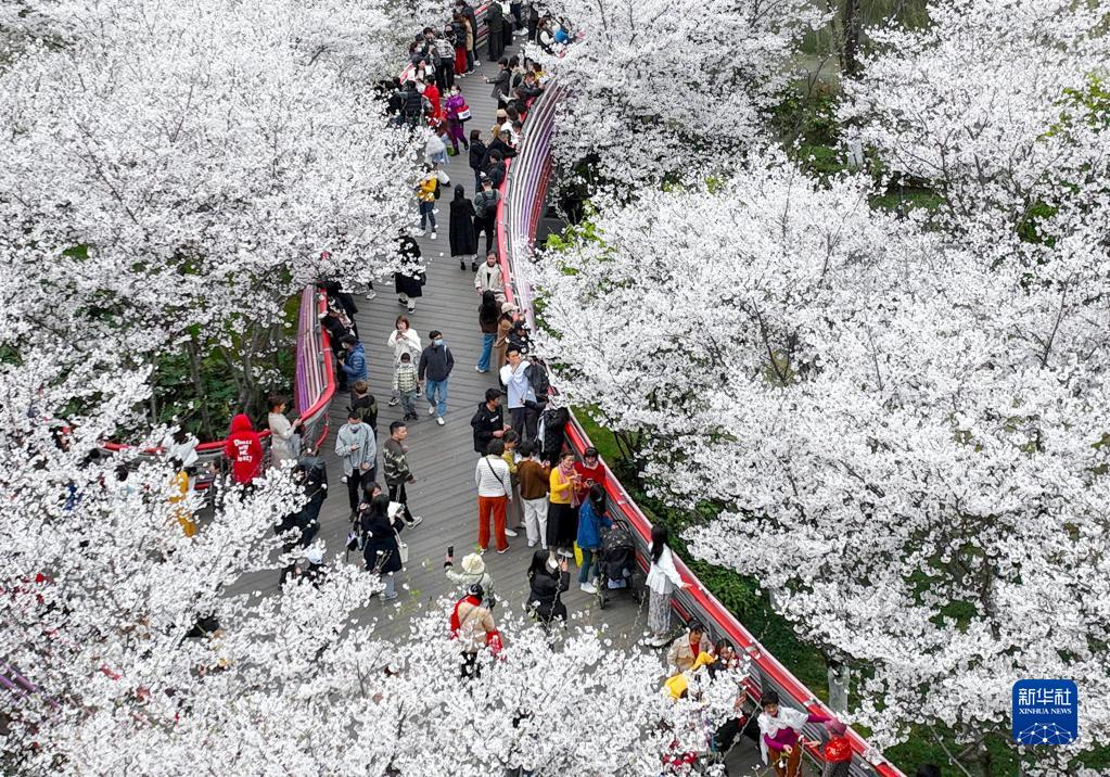3月20日,游客在浙江省寧波市鄞州區櫻花公園游玩賞花(無(wú)人機照片)。