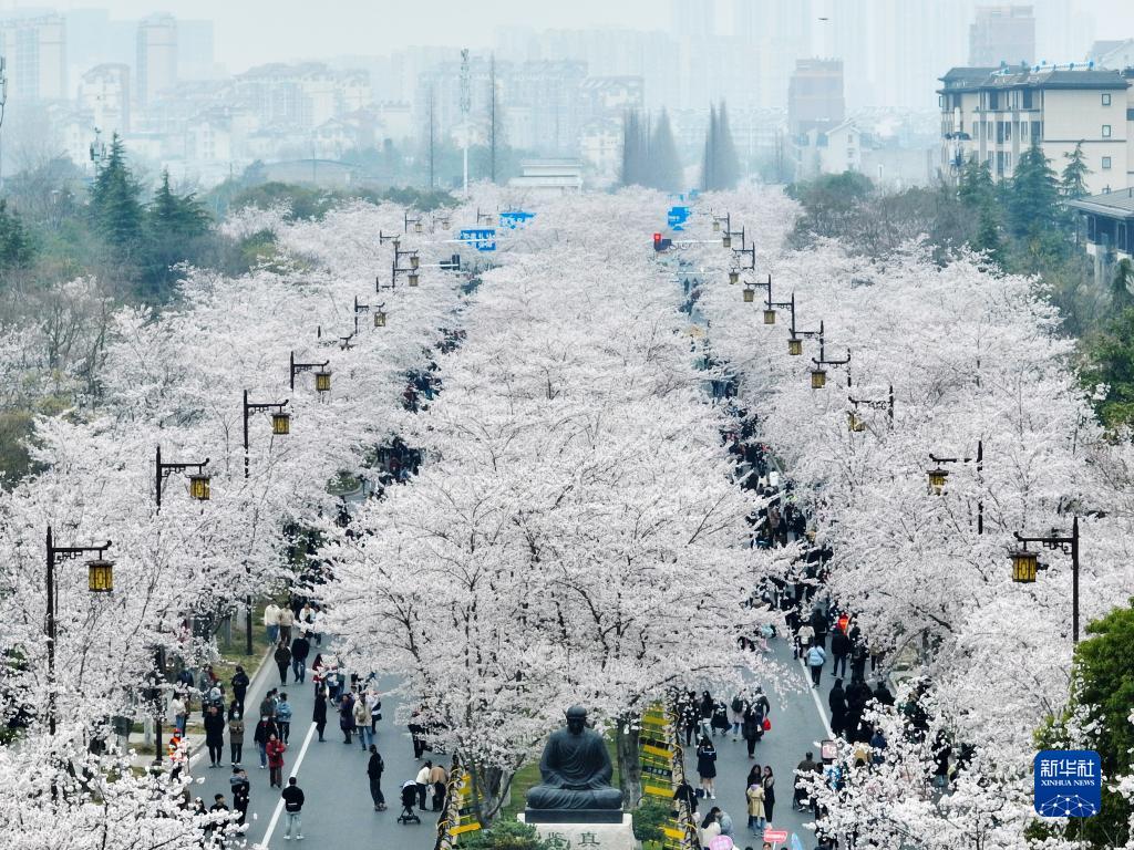 3月20日,游客在江蘇省揚州市鑒真路賞花游玩(無(wú)人機照片)。