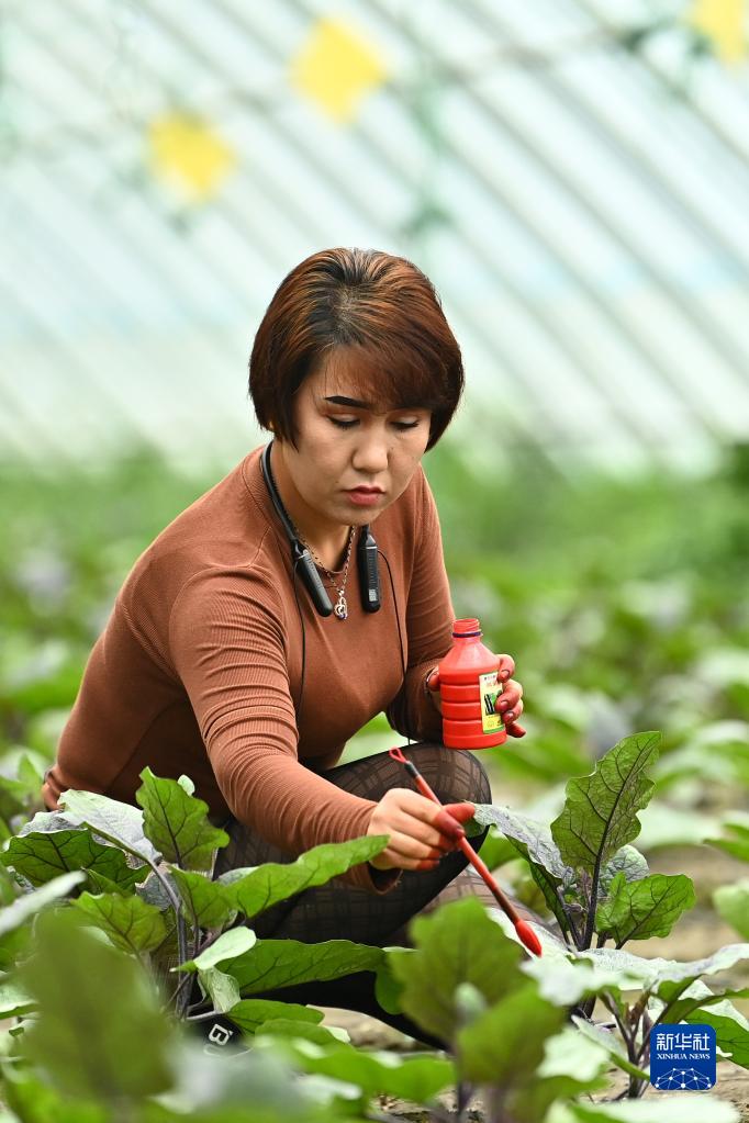 農民在新疆博湖縣現代設施農業(yè)示范基地物聯(lián)網(wǎng)日光溫室大棚為種植的茄子點(diǎn)花授粉(3月19日攝)。