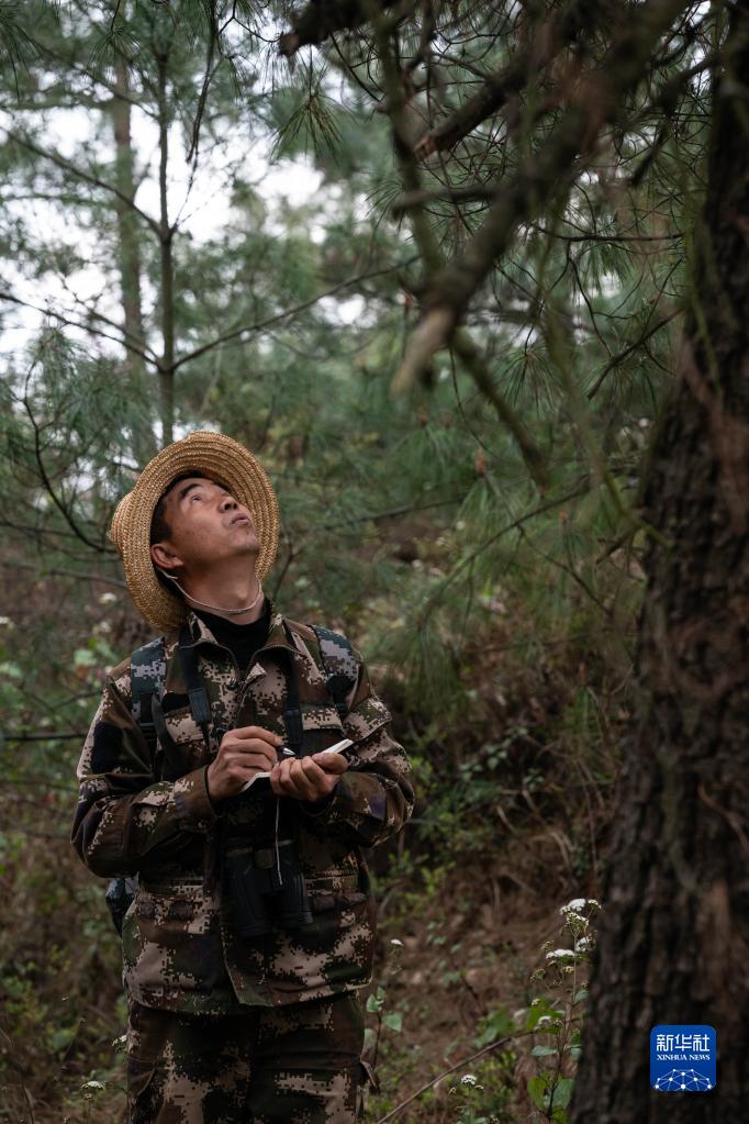 護林員陳華在記錄樹(shù)木生病情況(3月20日攝)。