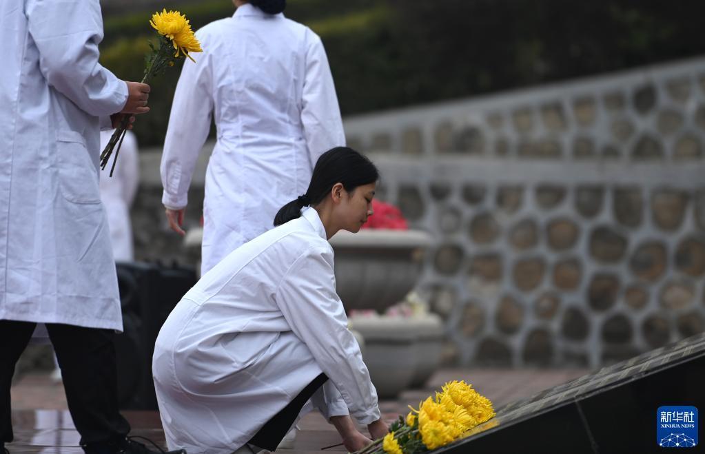 3月21日,在天津市薊州區元寶山莊生命紀念公園,天津醫科大學(xué)學(xué)生在奉獻碑前獻花。