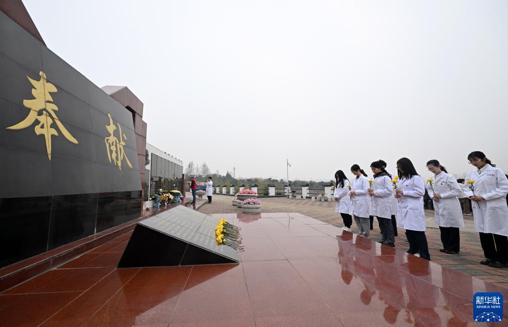 當日,天津醫科大學(xué)組織學(xué)生在位于天津市薊州區的元寶山莊生命紀念公園舉行向遺體捐獻者致敬活動(dòng)。在象征遺體捐獻者的奉獻碑前,學(xué)生代表們通過(guò)默哀、獻花、宣誓和詩(shī)朗誦等形式,表達對遺體捐獻者的緬懷和崇高敬意。
