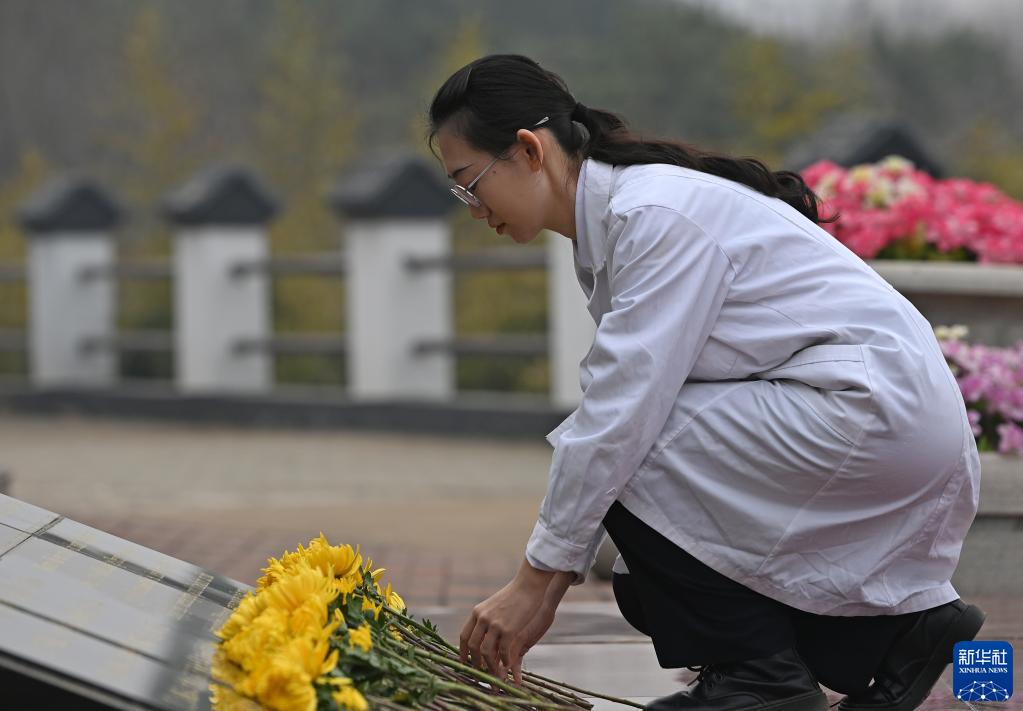 3月21日,在天津市薊州區元寶山莊生命紀念公園,天津醫科大學(xué)學(xué)生在奉獻碑前獻花。