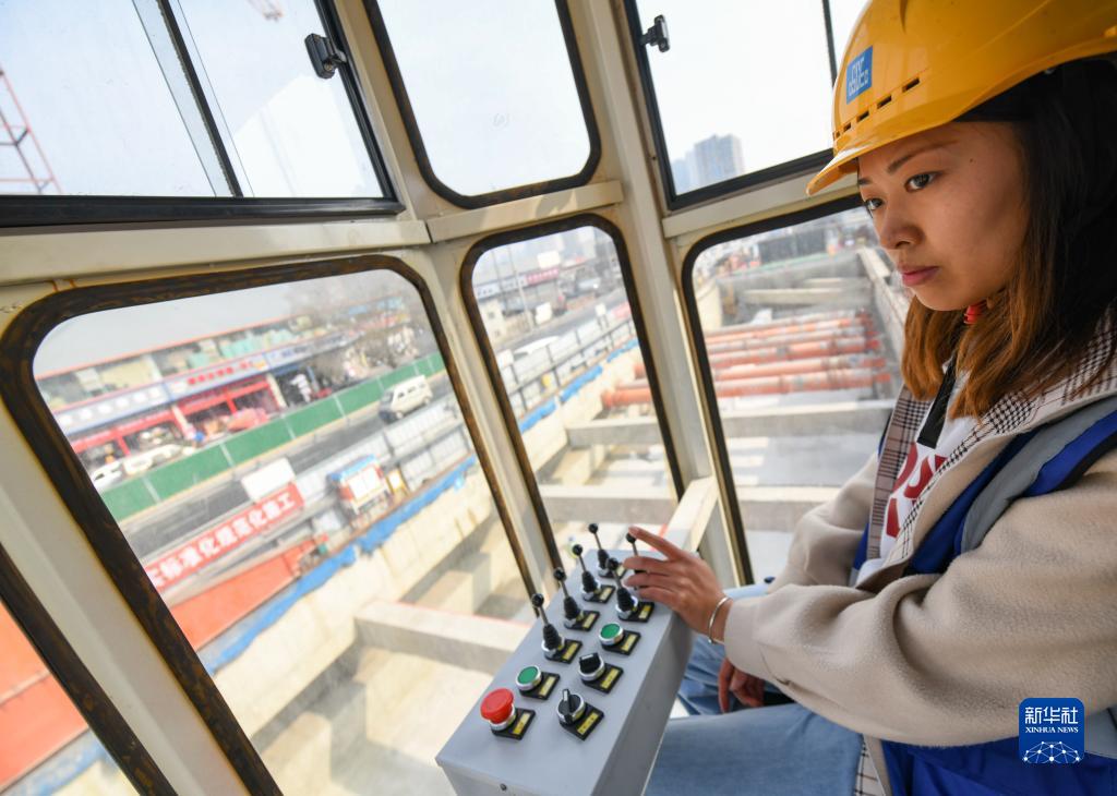 3月21日,在成都地鐵27號線(xiàn)金府站,中建三局的施工人員在操作龍門(mén)架作業(yè)。