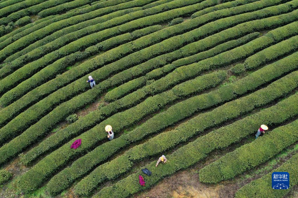 3月21日,在貴州省黔南布依族苗族自治州福泉市牛場(chǎng)鎮三江村山坪茶園,茶農在采摘春茶(無(wú)人機照片)。