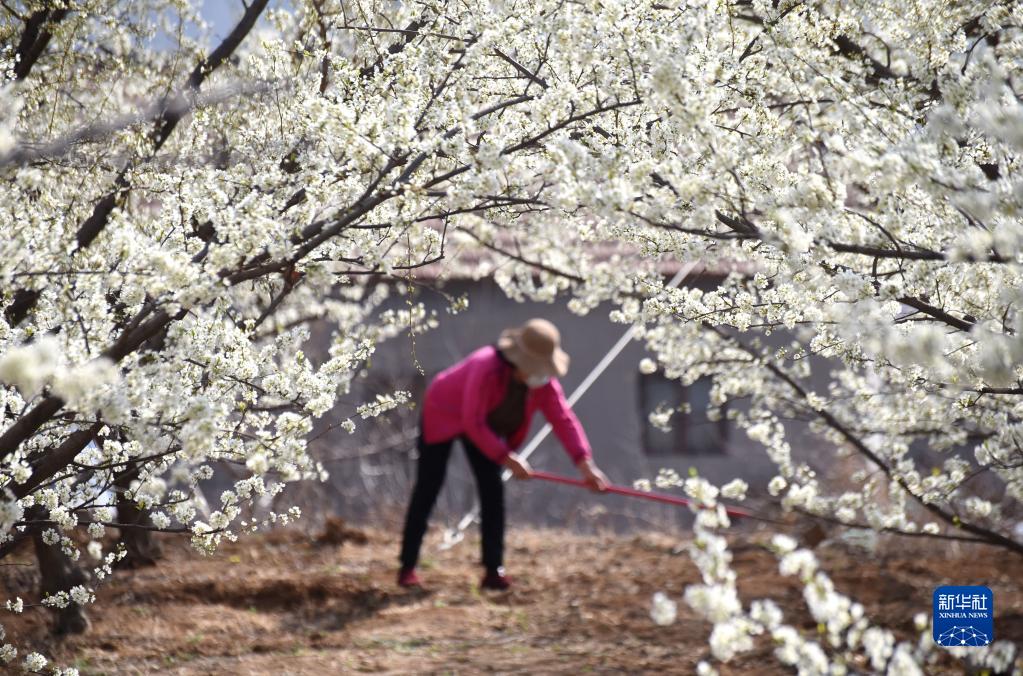 3月21日,山東省淄博市沂源縣中莊鎮河西三村的農民在李子園里勞作。