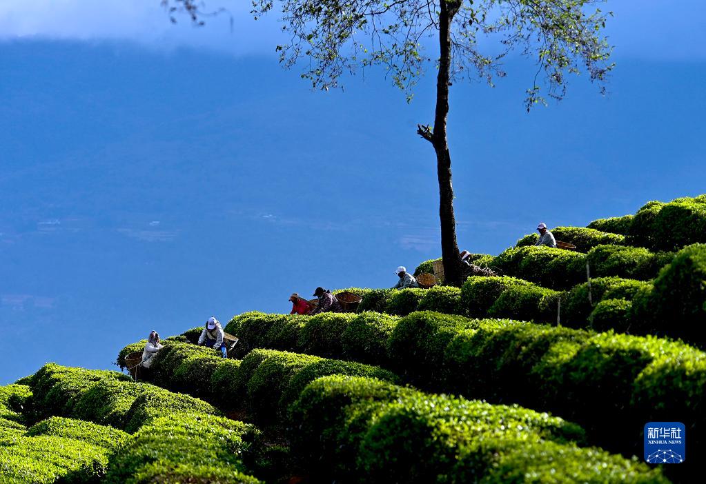 3月21日,云南大理南澗彝族自治縣公郎鎮羅伯克茶場(chǎng)的茶農在采摘春茶。