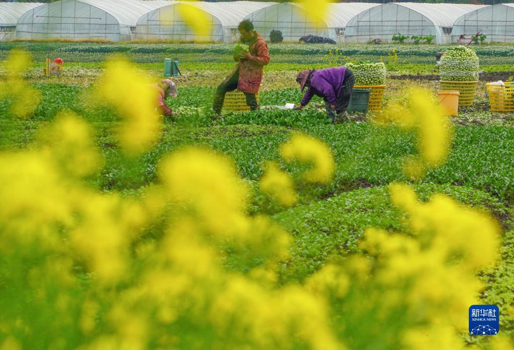 3月21日,在浙江省溫州市甌海區河頭村,農民在采收蔬菜(無(wú)人機照片)。