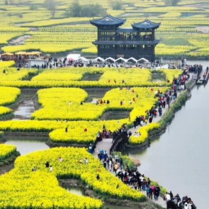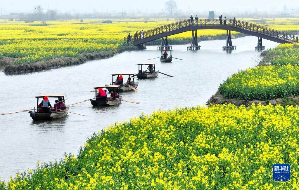 3月21日,游人在江蘇省興化市千垛菜花景區乘船游覽(無(wú)人機照片)。