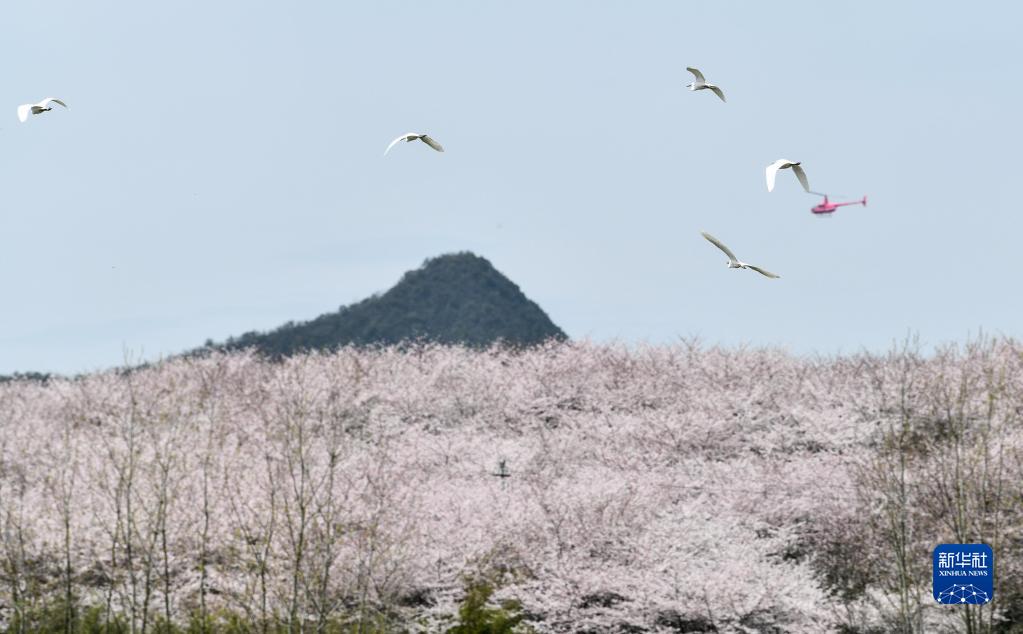 3月21日,一群鳥(niǎo)在貴州省貴安新區櫻花園內飛翔。