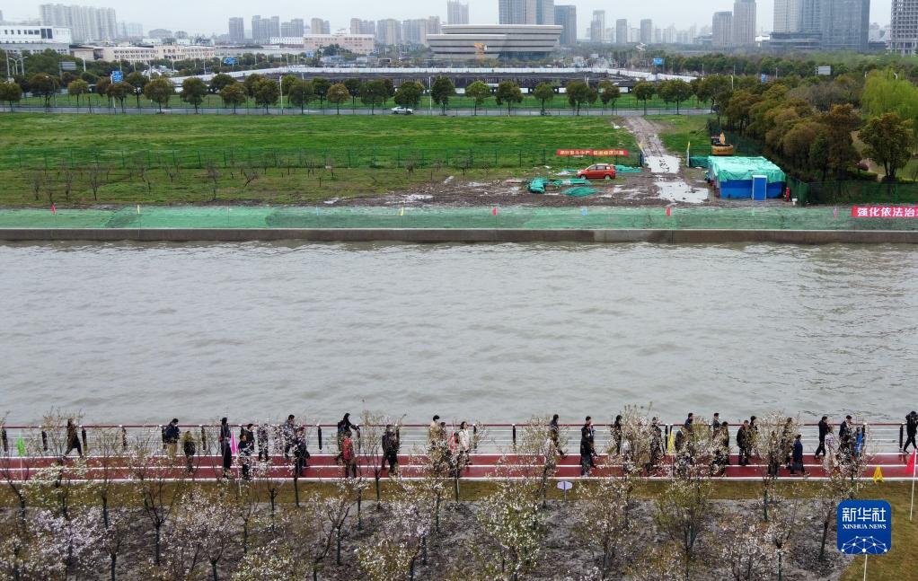 3月21日拍攝的位于洞涇港的松江新城綠環(huán)水脈建設現場(chǎng)(無(wú)人機照片)。
