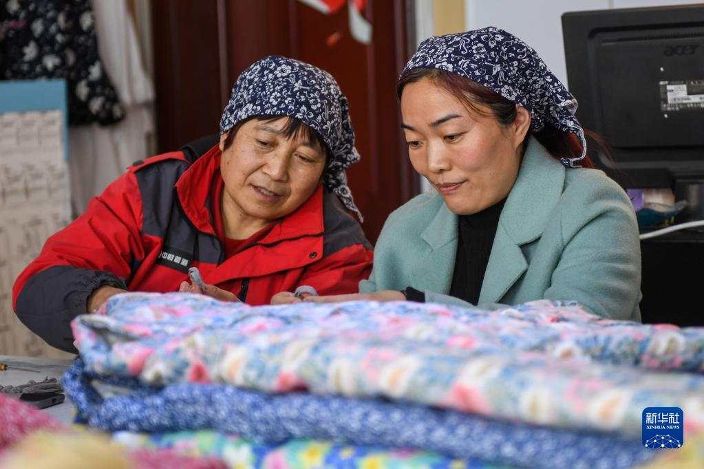 3月21日,兩名婦女在沂源縣棉花窩巾幗共富示范基地內加工制作棉衣。