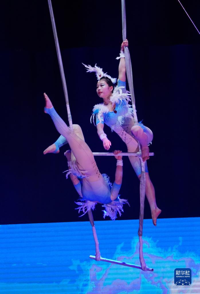 3月21日,在位于山東省濟南市的山東省會(huì )大劇院,演員表演雜技節目《雙人吊子》。