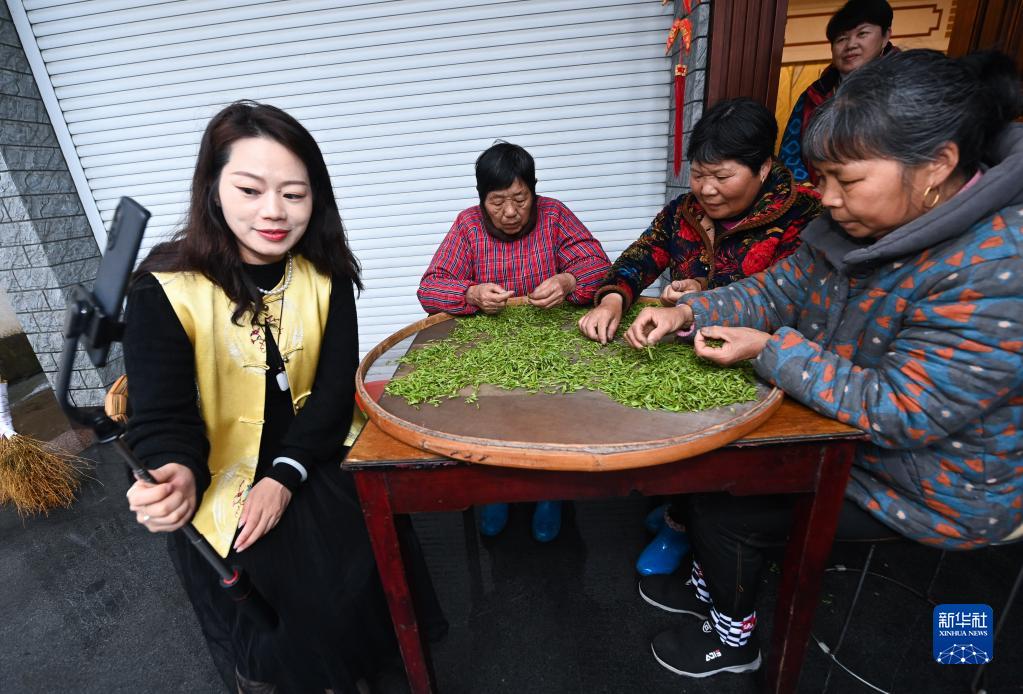 3月22日,一名女子在諸暨市趙家鎮東莊村上陽(yáng)自然村直播高山有機茶的制作情況,助力網(wǎng)上銷(xiāo)售。