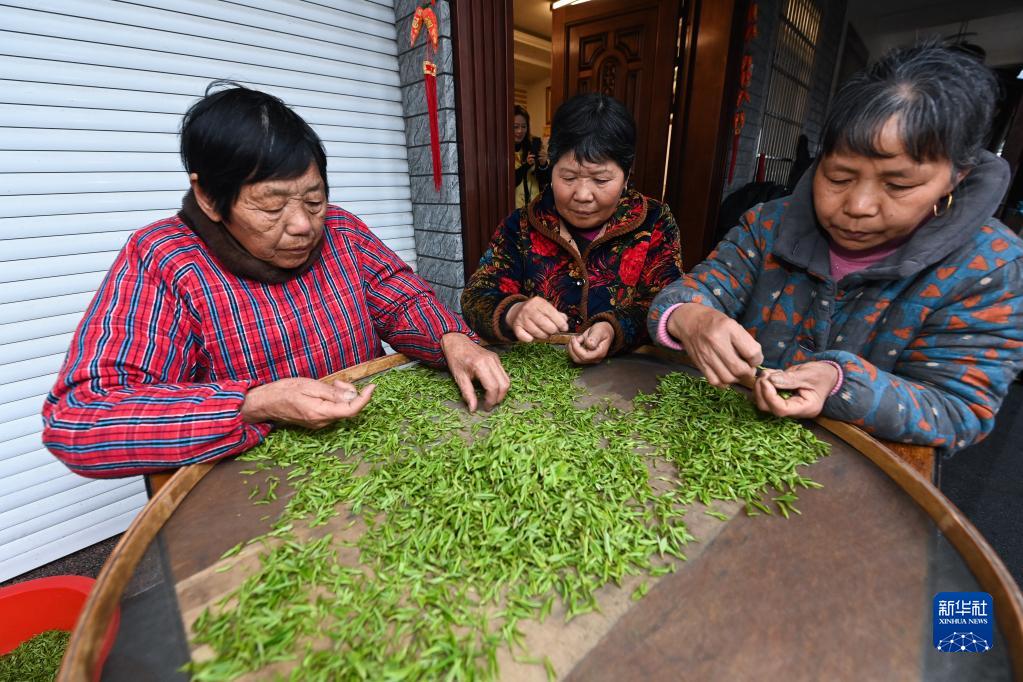 3月22日,趙家鎮東莊村上陽(yáng)自然村的茶農在挑選剛采摘的高山有機茶。