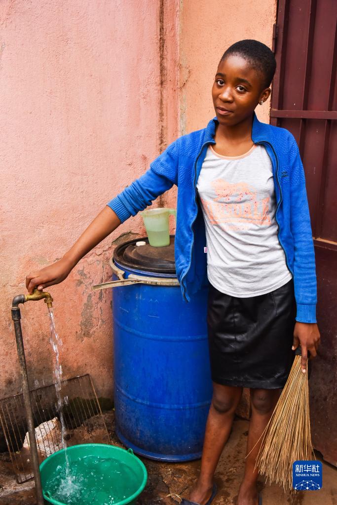 3月2日,在喀麥隆西部大區巴富薩姆,當地居民洛朗絲·萬(wàn)吉的女兒從水龍頭接水。