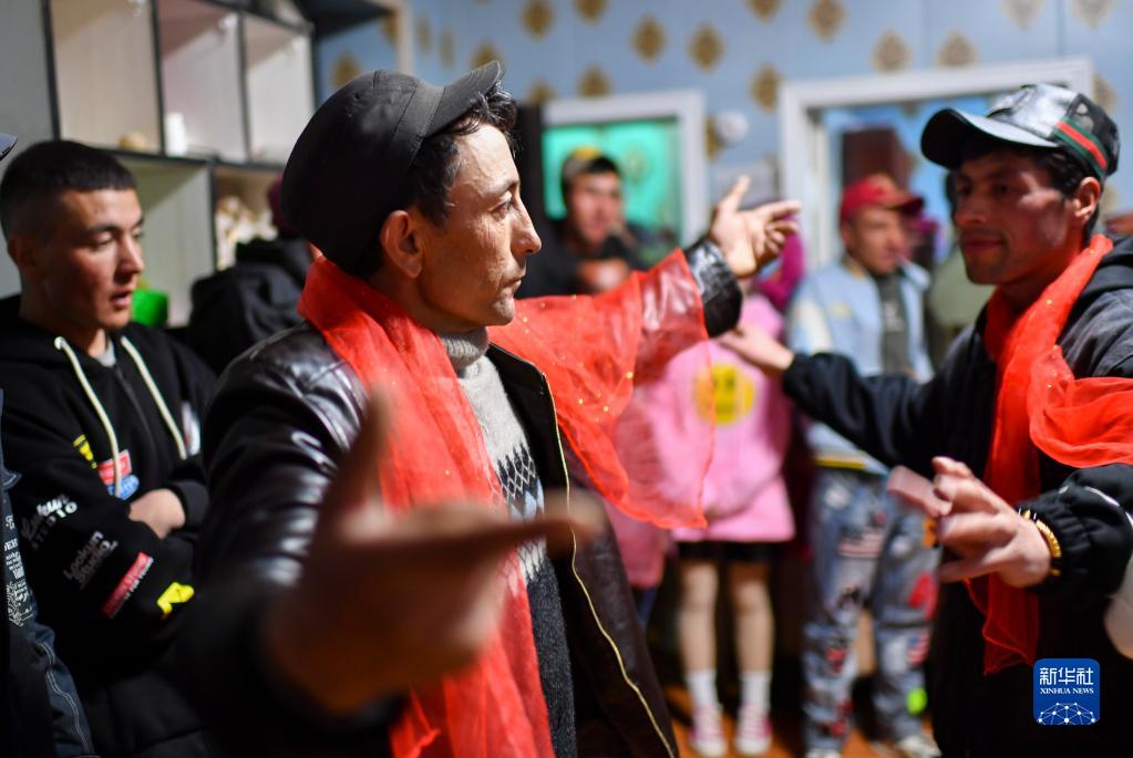 新郎買(mǎi)熱買(mǎi)提汗·青鐵木爾的親友在家中跳舞慶祝(3月18日攝)。