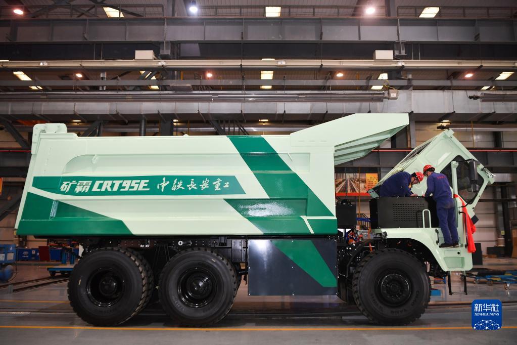 3月22日,中鐵長(cháng)安重工有限公司的工人在生產(chǎn)線(xiàn)上調試即將下線(xiàn)的95噸純電動(dòng)礦用自卸車(chē)。