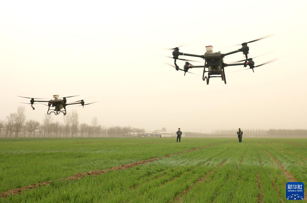 3月22日,在石家莊市欒城區溫家莊村,工作人員操作植保無(wú)人機為小麥施撒葉面肥。