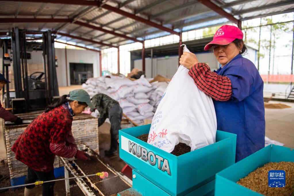 3月22日,在桃源縣金鳳橋水稻育秧工廠(chǎng),村民把育苗基質(zhì)裝入用于制作秧盤(pán)的機械設備。