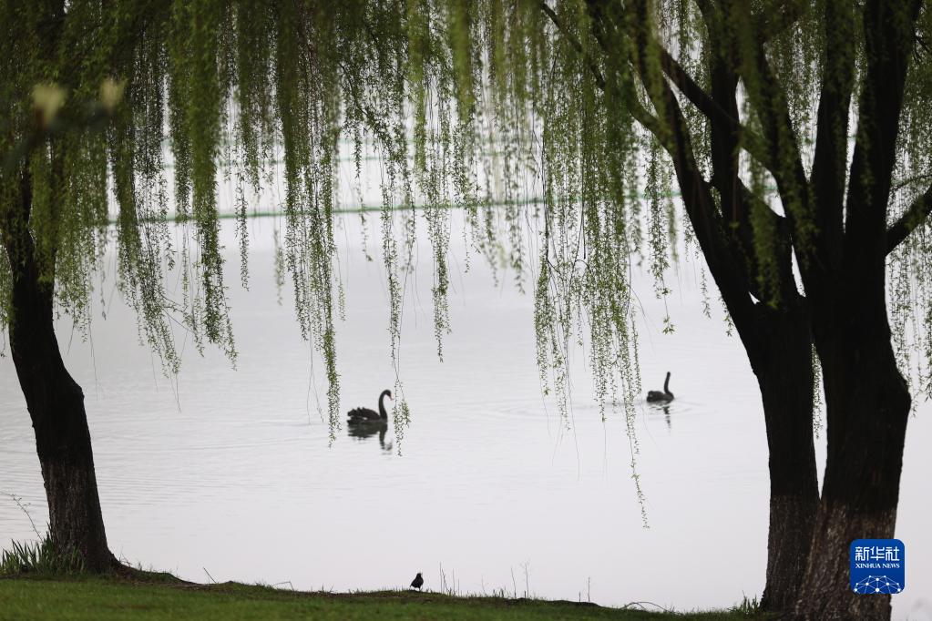 3月22日,浙江省湖州市吳興區西山漾國家城市濕地公園的柳樹(shù)吐出新芽,黑天鵝在水中嬉戲。
