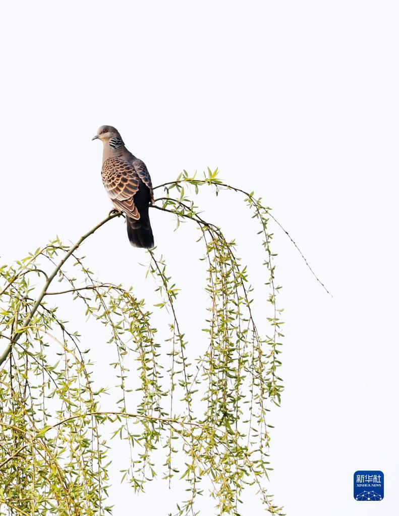 3月19日,在山東省臨沂市郯城縣白馬河濕地公園,一只小鳥(niǎo)在柳樹(shù)枝上停留。