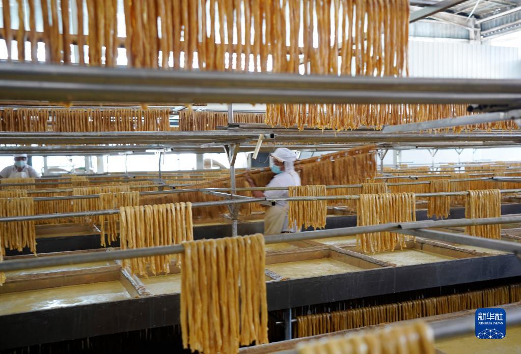 3月21日,石屏縣一家豆制品生產(chǎn)企業(yè)的工作人員在制作腐竹。