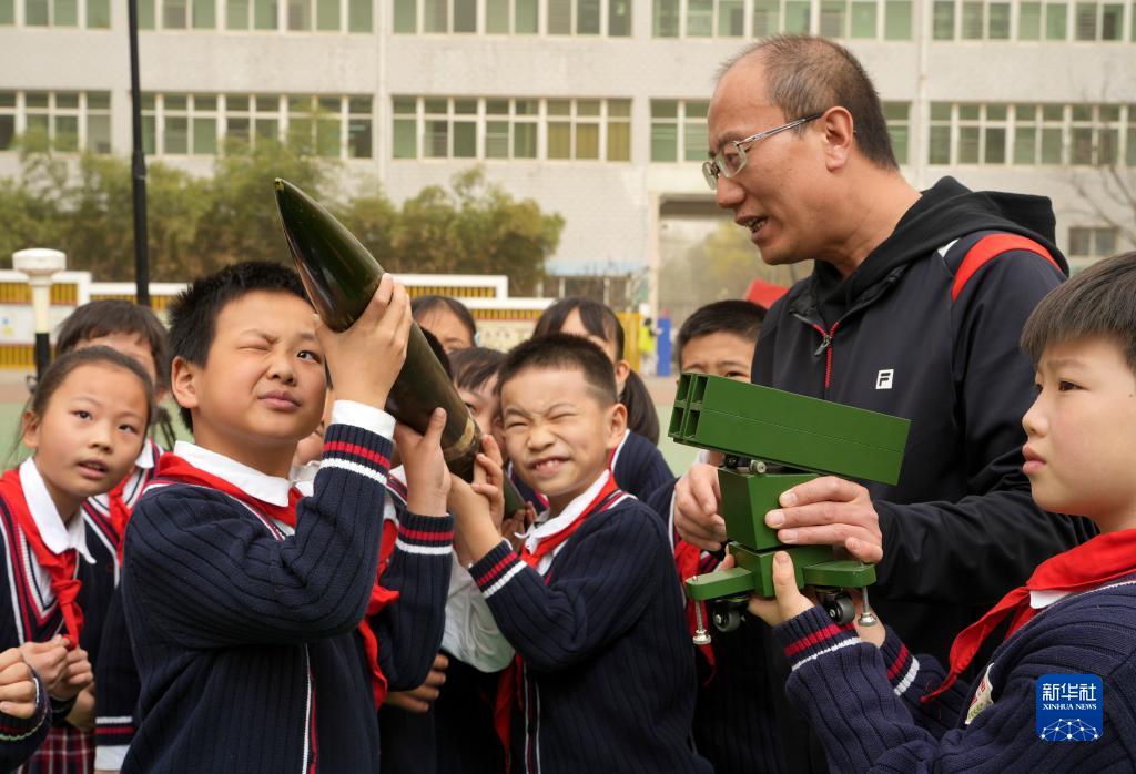 3月22日,在河北省石家莊市中山西路小學(xué),氣象工作人員為學(xué)生講解人工增雨作業(yè)火箭彈模型及工作原理。