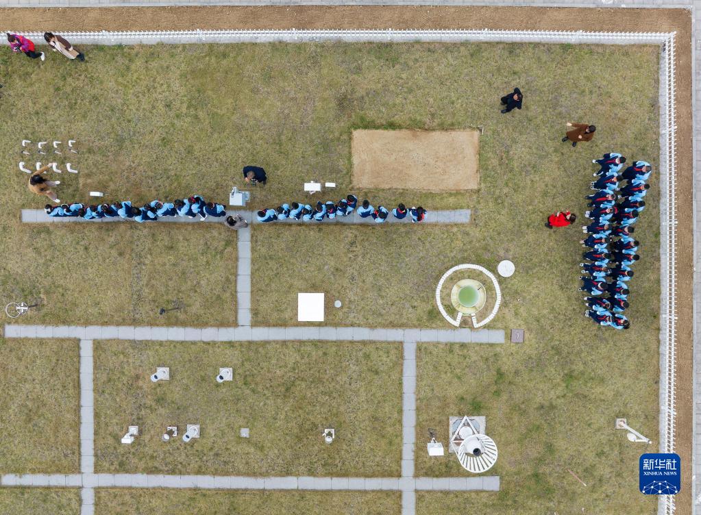 3月22日,在湖北秭歸國家基準氣候站,工作人員在為小學(xué)生介紹氣象設備知識(無(wú)人機照片)。