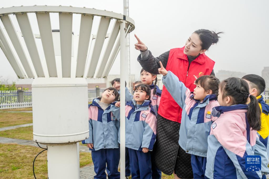 3月22日,在浙江省湖州市長(cháng)興國家氣象觀(guān)測站,科普志愿者向龍山街道中心幼兒園的孩子介紹氣象設備知識。