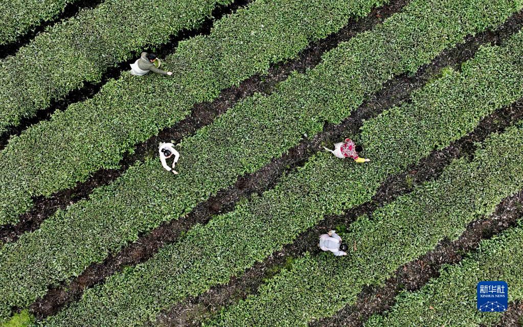 3月21日,茶農在貴州省綏陽(yáng)縣小關(guān)鄉大寨村的茶園里采茶(無(wú)人機照片)。