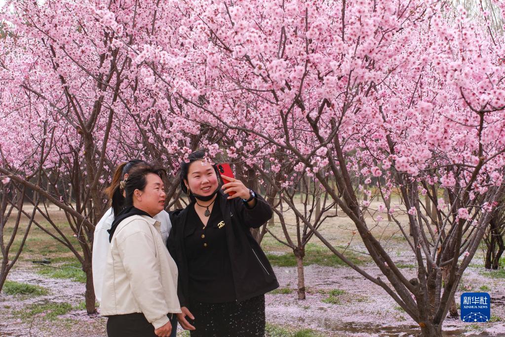 3月22日,游客在河南省安陽(yáng)市殷都區的洹春園賞花留影。