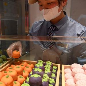 3月23日,工作人員擺放水果造型糕點(diǎn)。
