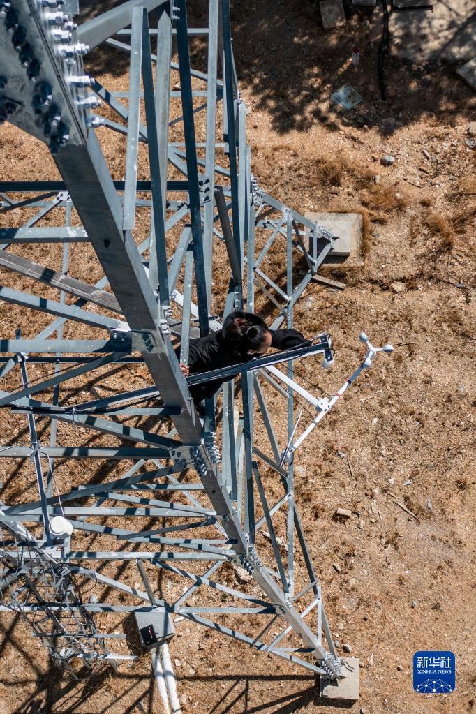 工作人員彭小清在香格里拉國家大氣本底站巡查鐵塔溫室氣體10米進(jìn)氣口(3月9日攝,無(wú)人機照片)。