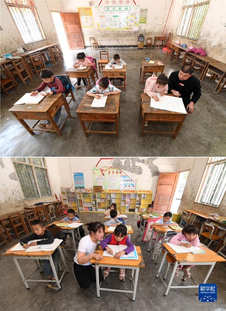 這是一張拼版照片:在廣西德??h東凌鎮那王小學(xué),黃永勇(上圖)和黃秀碧(下圖)在課堂上輔導學(xué)生功課(3月22日攝)。