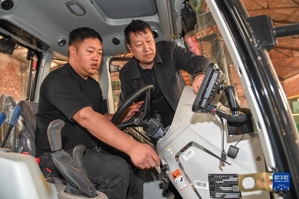 3月23日,在吉林省四平市梨樹(shù)縣白山鄉岫巖村,梨樹(shù)縣農機推廣總站站長(cháng)張志剛(右)幫助農民調試農機。