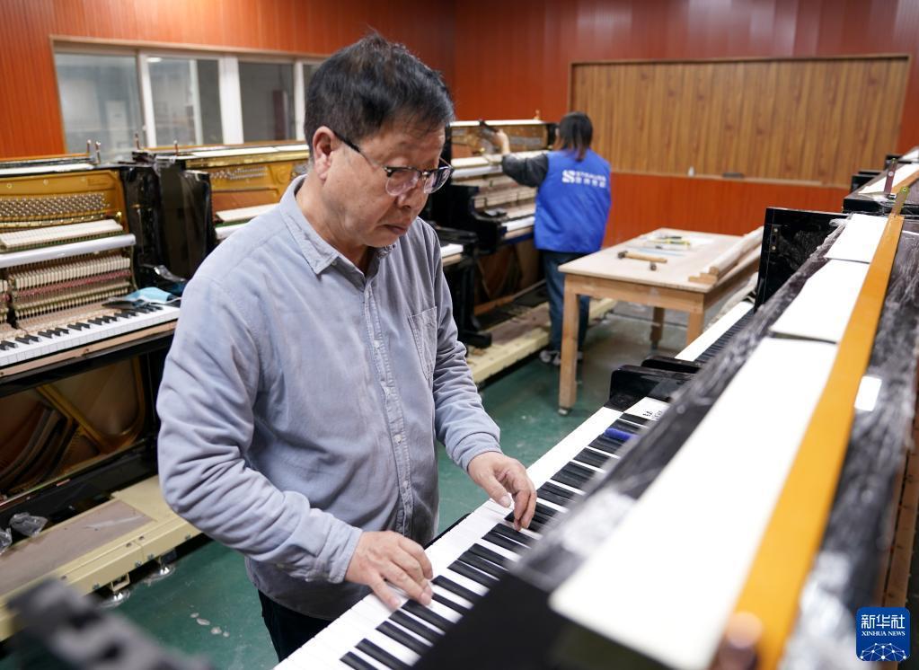 3月23日,來(lái)自韓國的鋼琴整音師李炳男在德清縣洛舍鎮東衡村一家鋼琴制造企業(yè)調試鋼琴。
