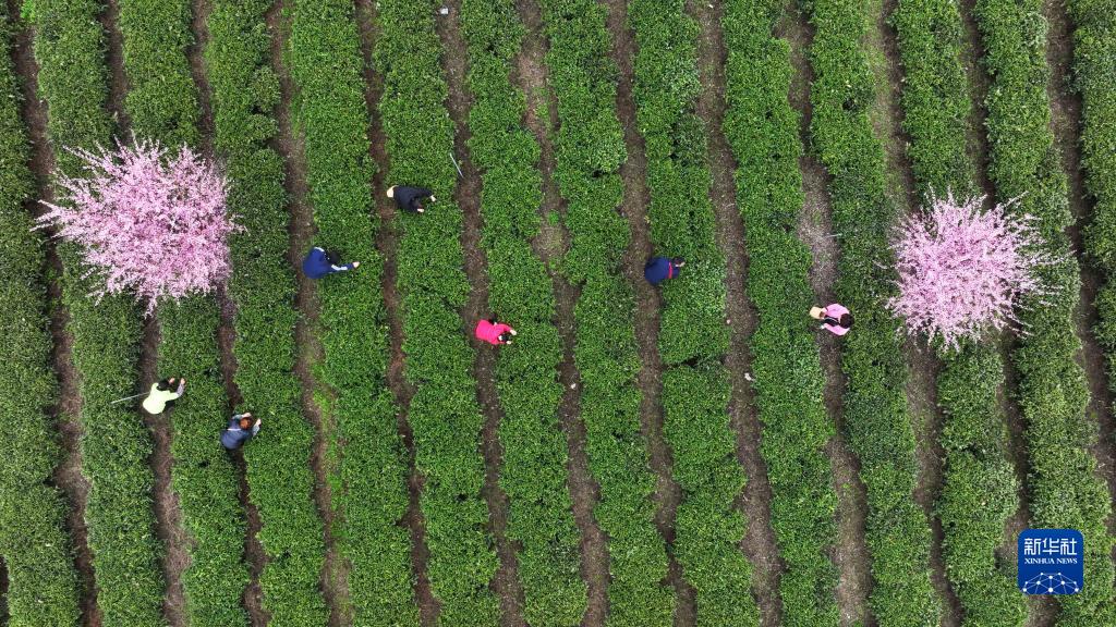 3月23日,村民在鳳岡縣永安鎮田壩社區生態(tài)茶園基地采摘春茶(無(wú)人機照片)。