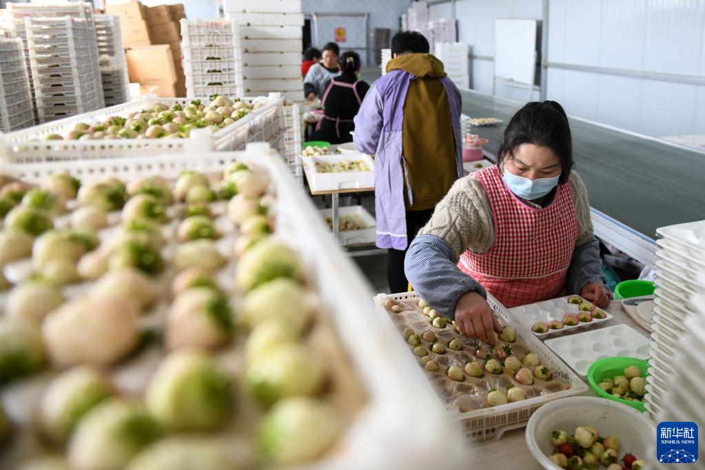 3月23日,村民們在南魯山鎮芝芳村金秋時(shí)節農業(yè)發(fā)展有限公司共富車(chē)間內分揀新品種草莓。