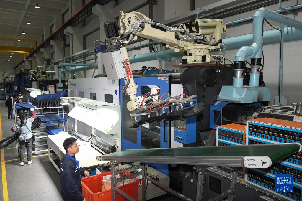 在位于臺州市的浙江博弈科技股份有限公司自動(dòng)化生產(chǎn)線(xiàn)上,工業(yè)機器人和人工合作生產(chǎn)汽車(chē)部件(3月21日攝)。該公司是國內汽車(chē)輕量化塑料零部件行業(yè)龍頭企業(yè),專(zhuān)注于高端汽車(chē)零部件生產(chǎn)。