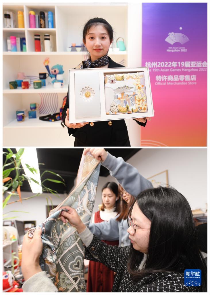這是一張拼版照片,上圖為:在位于杭州市的萬(wàn)事利絲綢展廳,工作人員在展示一款杭州亞運會(huì )特許商品;下圖為:在位于杭州市的萬(wàn)事利絲綢設計部,工作人員在討論一款絲巾的設計(3月20日攝)。萬(wàn)事利絲綢近年來(lái)加大提升文化創(chuàng )意能力,提升民族絲綢品牌影響力。