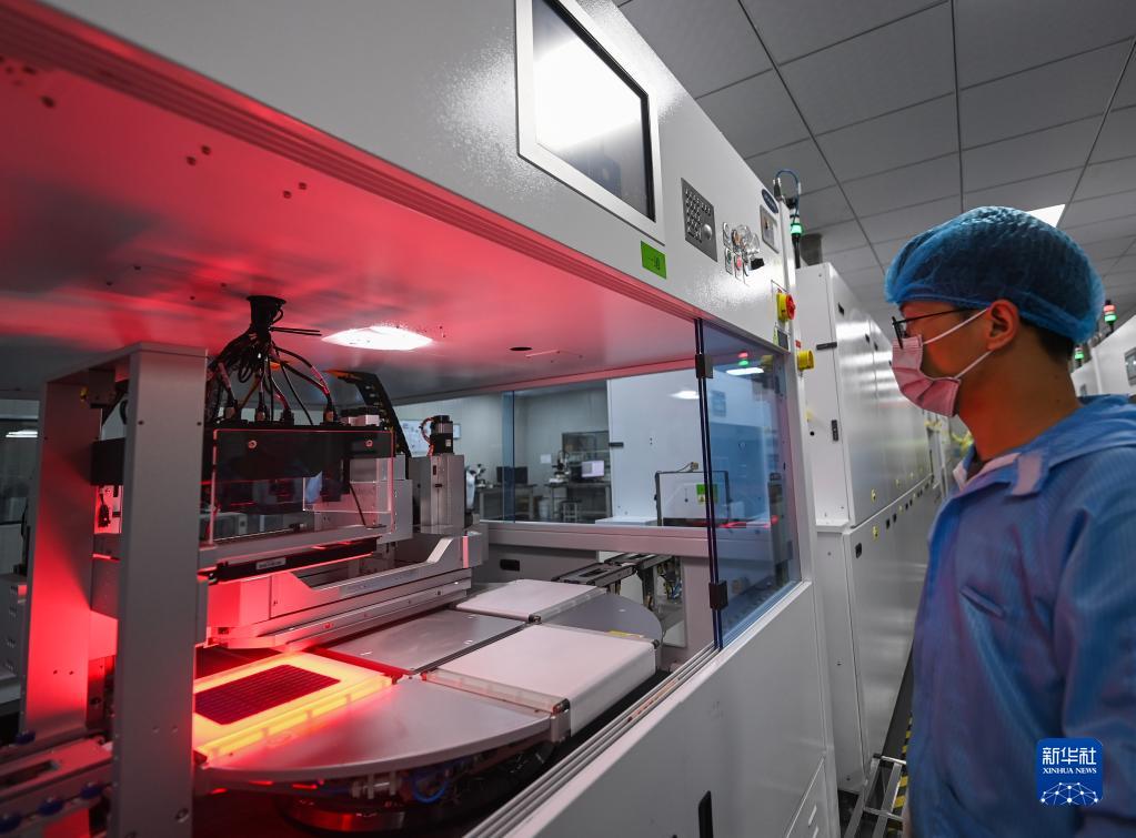 在杭州正銀電子材料有限公司的研發(fā)實(shí)驗室內,自動(dòng)化設備在進(jìn)行光伏板的絲網(wǎng)印刷(3月22日攝)。