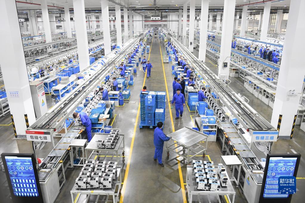 在位于臺州市的杰克科技股份有限公司,工作人員在裝配車(chē)間裝配縫紉機(3月23日攝)。