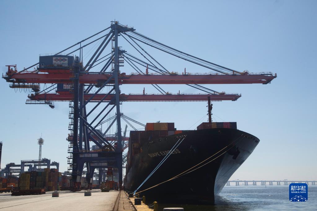 3月20日,一艘集裝箱貨輪??吭诎臀骼锛s熱內盧港一處碼頭。