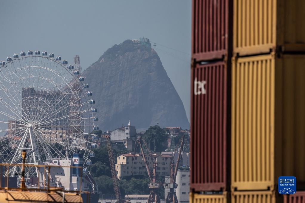 這是3月20日在巴西里約熱內盧港一處集裝箱碼頭拍攝的遠處的“里約之星”摩天輪和“面包山”。