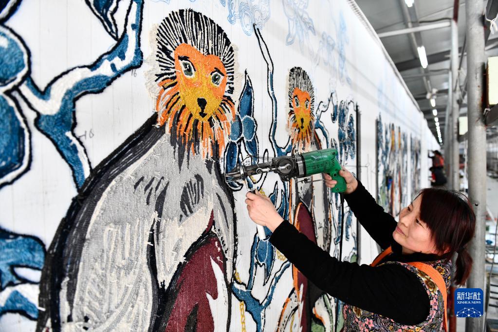 3月24日,在山東陽(yáng)信一家地毯生產(chǎn)企業(yè),工作人員在編織地毯。
