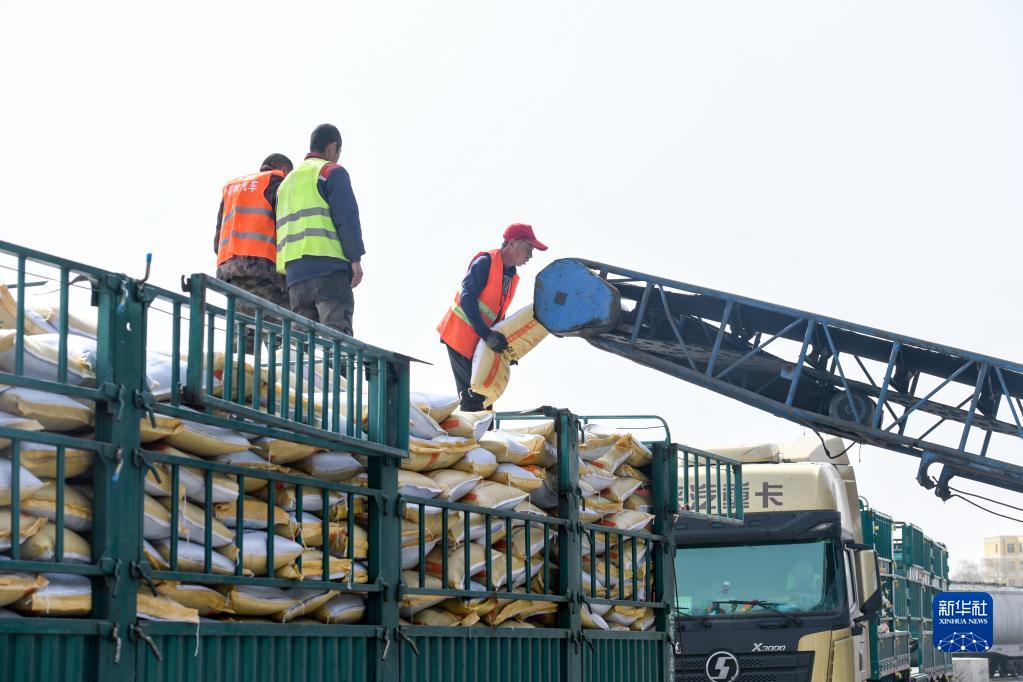 3月23日,工人們在寧安站貨場(chǎng)卸化肥。